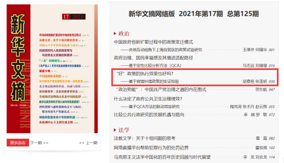 2022年4月28日,365英国上市集团胡春艳教授与研究生张莲明2021年在《公共行政评论》发表的论文《“好”政策的执行效果也好吗?——基于容错纠错政策的实证检验》被《新华文摘》(数字版)2021年第17期(半月刊)“政治”栏目全文转载。